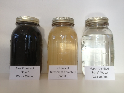 Aspen Integrated System’s chemical treatment, ultra-filtration, and evaporation processes were demonstrated in field tests performed in Pennsylvania’s Marcellus Shale region. Raw flowback (“frac”) water was recycled using Aspen’s first generation, multi-stage water recycling process with exceptional results. The water samples shown to the right depict a raw waste sample, a partially treated intermediate process sample, and the final “pure” water result. At 0.33 μS/cm (microsiemens/cm, a measure of electrical conductance), the recycled water is actually very well in excess of the 100-500 μS/cm level of most good drinking water. Our “pure” water result was produced as a striking proof of concept; in actual production, the water will meet or exceed normal drinking water parameters.