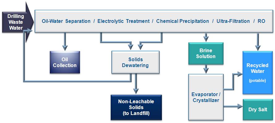 The Wastewater Recycling Process Model (shown below) depicts a comprehensive water recycling approach that accepts water produced during gas exploration and production activity as influents and yields water meeting the discharge specifications set by State, Federal and many international regulatory agencies (i.e. “potable water”), solid waste, and can also yield, as seasonal demand may dictate, a salt brine for road application (or converted to crystallized salt) in a full scale production system.