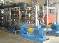 The hot brine solution is fed to the Crystallizer, where the concentrated slurry is circulated through the Heating Elements. The circulating brine in the first effect Heating Element is heated with steam which condenses on the vapor side. The heated and concentrated brine slurry which is circulating in the brine-side of the heating elements is discharged from each Heating Element into its respective Vapor Separator. The water vapors separate from the slurry in the Vapor Separators. The vapors from each effect Vapor Separator are discharged into the vapor side of the subsequent effect Heating Element, where they finally condense for discharge into the vapor side of the main Surface Condenser. The concentrated slurry is pumped from the Vapor Separator to the hydro-clone thickener, and from there to the centrifuge where the wet crystal cake will be separated from the mother liquor.